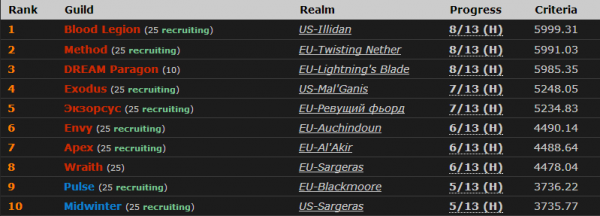 UPD:Будем обновлять Шапку поста и добавлять видео киллов Robert, gp-amd. На данный момент основная гонка идет между гильдиями Method (8/13), Blood Legion (8/13) и DREAM Paragon (8/13). Так-же не отстают и другие известные гильдии Экзорсус (7/13), Exodus (7/13) и Envy (6/13). Первыми в мире одолеть Джин'рока Разрушителя ... Читать дальше » |